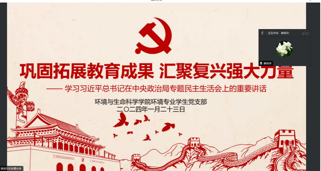 环境专业学生党支部以腾讯会议的形式开展主题党课。党课的内容分为两个部分,分别为深入贯彻习近平在中央政治局专题民主生活会上的讲话内容和学习贯彻习近平新时代中国特色社会主义思想主题教育第一批单位专题民主生活会情况的报告。本次会议由环境专业学生党支部书记莫莉萍主持,参会人员为环境专业学生党支部全体党员。