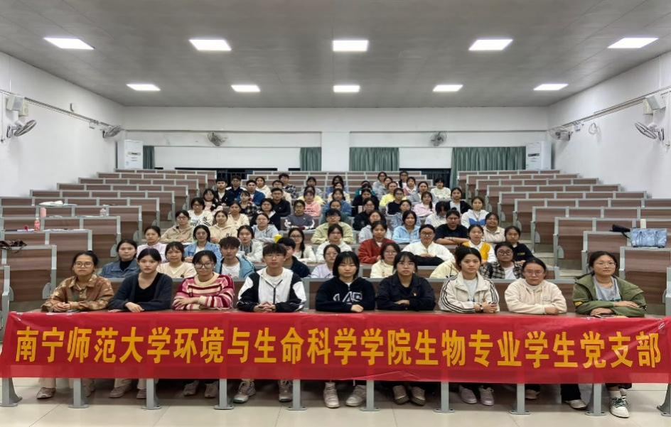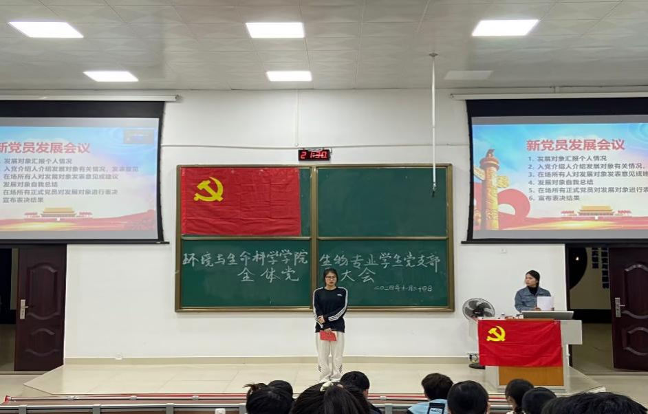 生物专业学生党支部在武鸣校区地海楼B109教室召开预备党员接收会议。本次会议采取线上线下相结合的方式,主要议题是讨论冯仁龙等43名发展对象接收为预备党员的问题,会议由梁彩叶同志主持。