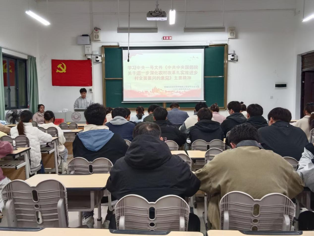 环工专业学生党支部于2025年3月9日晚在武鸣校区1号教学楼118教室召开专题会议,深入学习2025年中央一号文件《中共中央国务院关于进一步深化农村改革扎实推进乡村全面振兴的意见》。支部书记曲炳鹏及全体党员参会学习。
