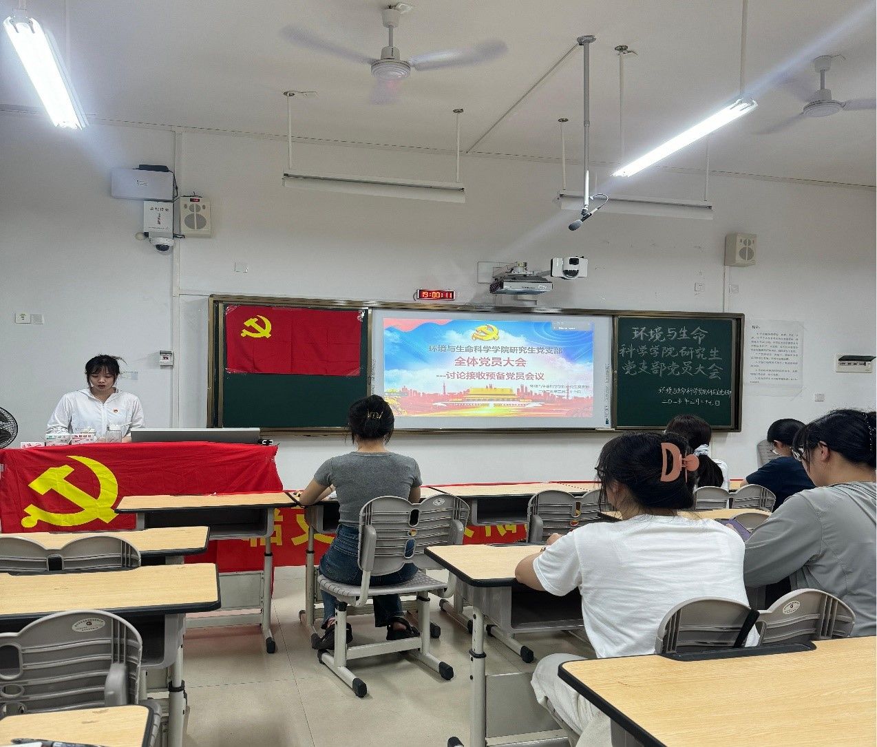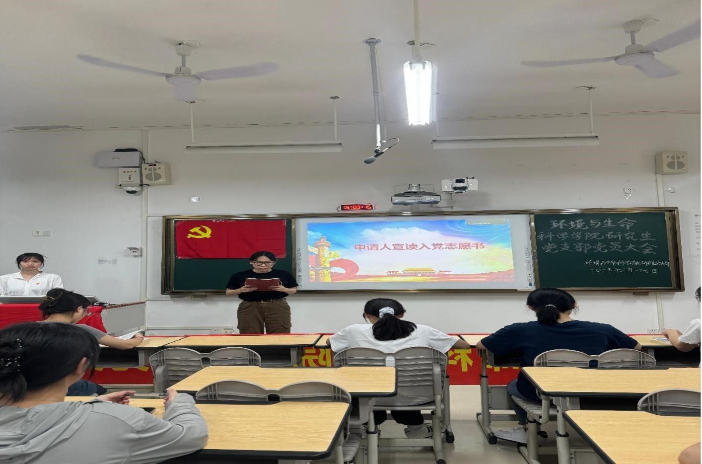 研究生党支部在武鸣校区1号教学楼213教室召开全体党员大会,会议以线上线下相结合的方式进行,主要议题是讨论接收许秋怡同志为预备党员。本次会议由支部书记潘艳桃同志主持。
