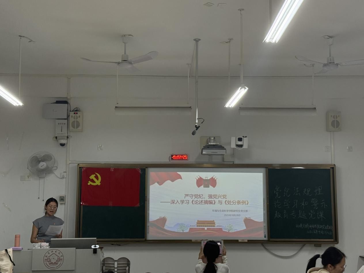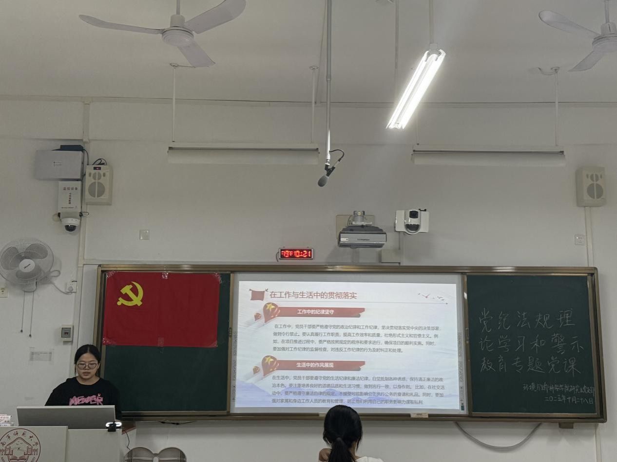 研究生党支部于武1-202教室开展党纪法规理论学习和警示教育专题党课。会议由党支部书记卢恩敏主持,研究生党支部全体党员参加会议。