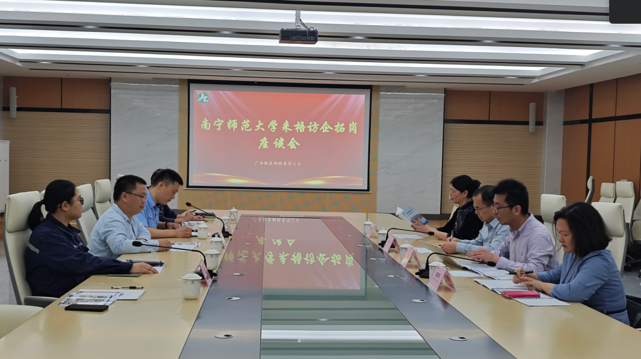 在广西翅冀钢铁有限公司,调研组跟随公司人力资源处走进了钢材生产车间、化验大楼、公司配套生活休闲娱乐设施进行参观。随后调研组与广西翅冀钢铁有限公司开展座谈会、往届毕业生代表开展座谈,两个学院领导分别介绍了2025届毕业生信息,并邀请广西翅冀钢铁有限公司参与校园专场招聘会,双方就深化校企合作、产教融合,创新人才培养模式等方面进行了深入交流。