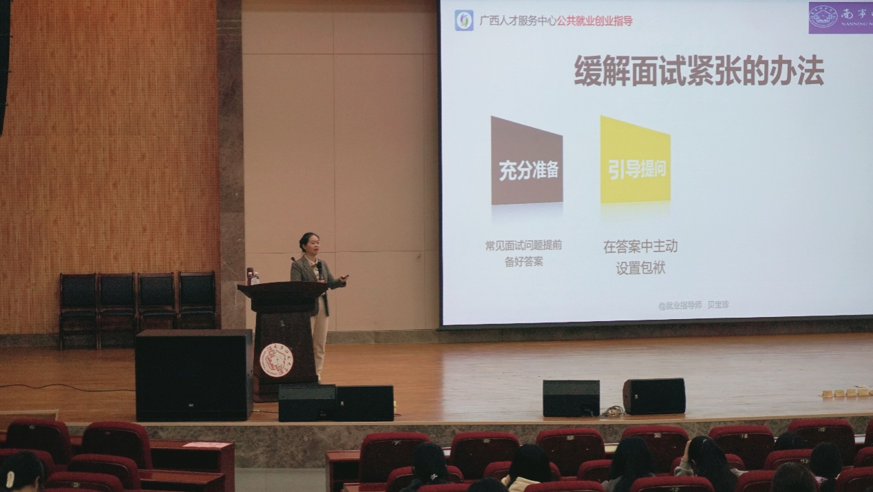 在武鸣校区图书馆报告厅召开2025届毕业生春季学期就业创业工作推进会。学院党委副书记(主持党委工作)韦东林、学院党委副书记刘启满,广西南宁贝塔栖商务服务有限公司总监贝宝珍,学院就业负责人及就业指导教师参会。