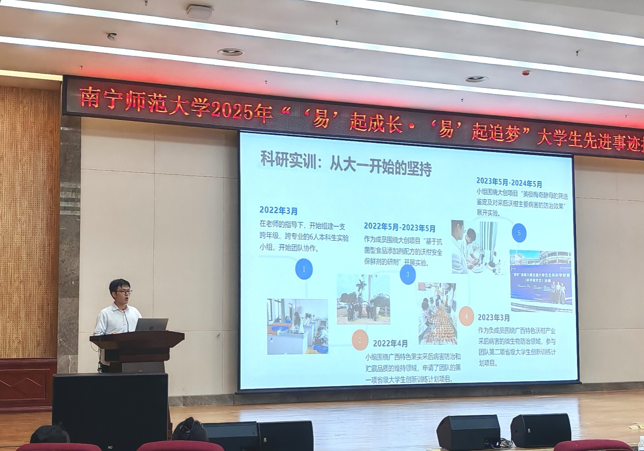5月23日下午,*偷拍网 2021级生物科学2班学生代表蒋琳华在武鸣校区图书馆报告厅参加“‘易’起成长,‘易’起追梦”大学生先进事迹报告会,并作主题分享。
