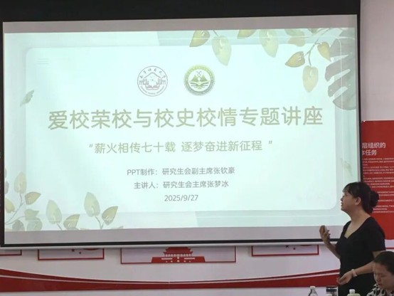 的发展历程。从学校与学院特色学科的起源、一脉相承的育人理念等办学传统,到近年来在科研领域取得的丰硕成果、人才培养质量的显著提升等重大成就,张梦冰同学均进行了细致讲解。此外,她还重点解读了校院 “十五五” 规划中的核心目标,涵盖学科建设升级、研究生培养模式创新、产学研深度合作等关键方向,帮助新生清晰认识到个人发展与校院集体发展的紧密联系,进一步增强了大家对学校和学院的认同感、归属感与自豪感。