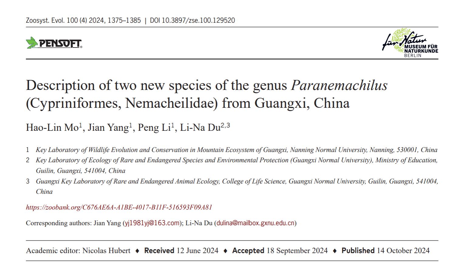 2021级生物科学专业本科生莫昊霖同学以第一作者的身份在国际动物分类学期刊《Zoosystematics and Evolution》(SCI收录,影响因子1.6,JCRQ2,中科院二区)上发表了题目为《Description of two new species of the genusParanemachilus(Cypriniformes: Nemacheilidae) from Guangxi, China》的研究论文(doi: 10.3897/zse.100.129520.)。该论文是在该院杨剑研究员和广西师范大学生命科学学院杜丽娜副教授共同指导下完成的。这是继该院本科生钟佳宏同学以第一作者身份于2024年9月发表SCI论文以来的第2篇以本科生作为第一作者在同一SCI期刊发表的学术论文。