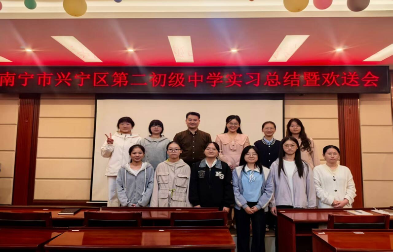 生物科学专业10名实习生于南宁市兴宁区第二初级中学顺利完成教育实习。实习生们以饱满的热情深度融入校园教学与管理实践,全面参与室内升旗仪式、班主任工作例会、主题班会组织及消防应急演练等多项活动,在沉浸式体验中积累校园工作经验。