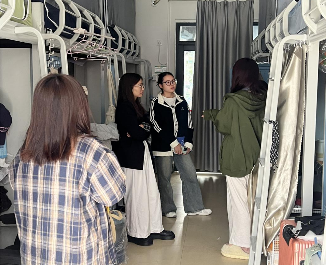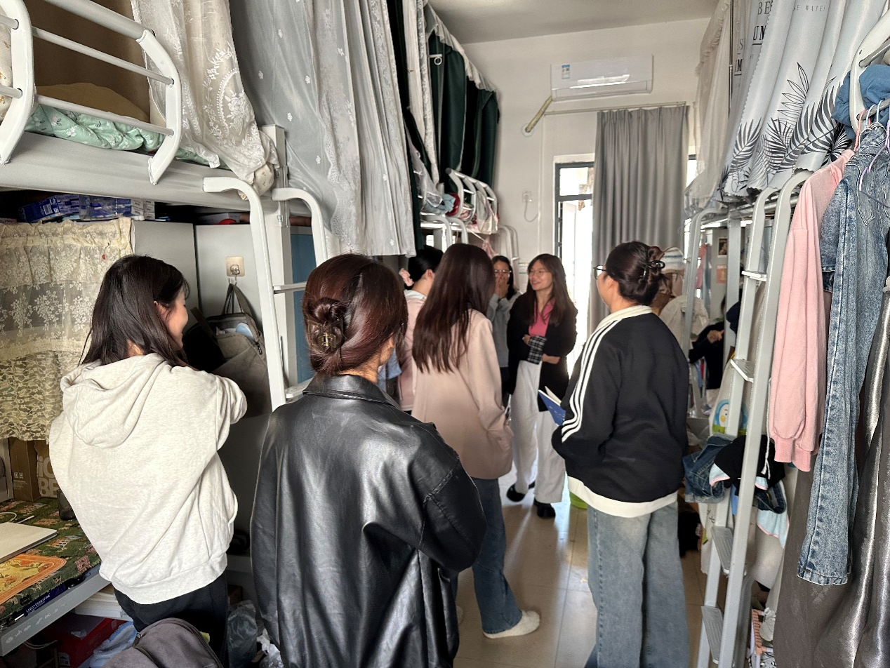 团委书记刘雅楠、辅导员龚炜婷、兼职辅导员以及主席团成员走访学生宿舍,深入了解学生思想、学习和生活等情况。