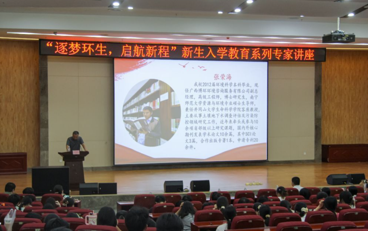 在武鸣校区图书馆一楼报告厅举办“逐梦环生,启航新程”新生入学教育专题讲座。本次活动由学院党委副书记刘启满主持,特邀我校优秀毕业生、资源与环境专业研究生导师、现任广西博环环境咨询服务有限公司副总经理的张荣海担任主讲。张荣海校友主要从事土壤地下水调查评估及污染防控领域研究工作,近年来牵头或参与10余项省部级以上研究课题,国内外核心期刊发表学术论文10余篇,其中SCl论文3篇,合作出版专著1本,申请专利20余件。此次应邀到来,主要以亲身经历为师生分享成长故事与职业感悟。党委副书记刘启满、环境工程系主任王鑫宇、梁洲辅教授、研究生班主任莫莉萍等教师代表、25级研究生新生、本科各班代表共同聆听了这场精彩讲座。
