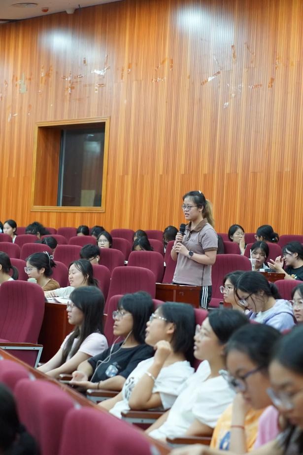 在报告中,曾哲老师以“从教研视角谈教育智慧的生成”为主题,结合自身多年教学经验,向2025级新生传递核心感悟:“教育需要爱与智慧。” 她指出,教育需要爱与智慧。教师应怀着仁爱之心,在不断地学习本领中实践创新,在不断地自我成长中成就学生。针对教育行业的共性需求,曾老师提到 “跨学科” 趋势下,无论教授何种学科,教师的核心共性在于具备教育智慧。