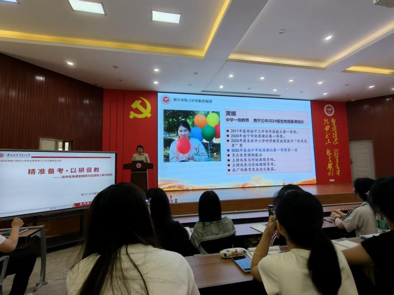 随后,黄娜老师结合自身获奖教学实践开展分享。她从教学设计、课堂组织、学情把握等方面,系统讲解高中生物教学的实践技巧与创新思路。分享中,她提及AI技术在优化教学流程、辅助学情分析等方面的辅助应用,为同学们提供了兼具传统智慧与现代理念的教学范式,让大家对生物课堂教学有了更直观且全面的认知。