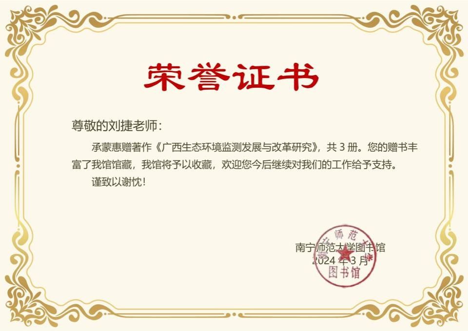 浓浓桃李香,漫漫书香情,2024年3月,我校环生院2003级环境科学专业优秀校友刘捷向母校图书馆捐赠图书《广西生态环境监测发展与改革研究》,展示了她对学校的深厚情感。