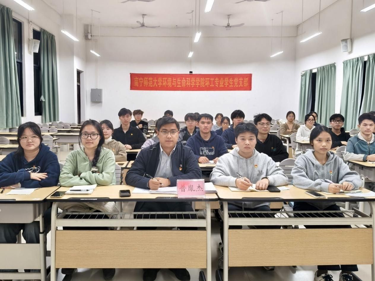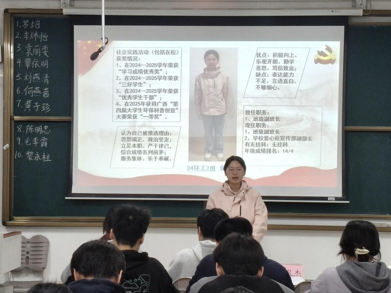 环工专业学生党支部于武鸣校区1号教学楼120教室召开预备党员接收会议。支部书记普胤杰、全体党员及10名发展对象参会。