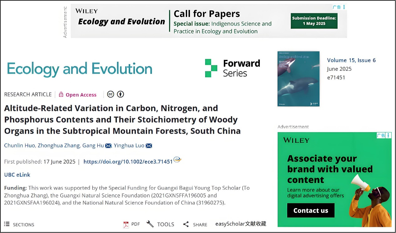 近期,我校生态和环境修复高水平人才团队在山地森林生态化学计量学研究领域取得新进展。相关成果以“Altitude-relatedVariation inCarbon,Nitrogen, andPhosphorusContents andTheirStoichiometry ofWoodyOrgans in theSubtropicalMountainForests,South China”为题发表在国际学术期刊Ecology and Evolution(中科院2区)。偷拍网