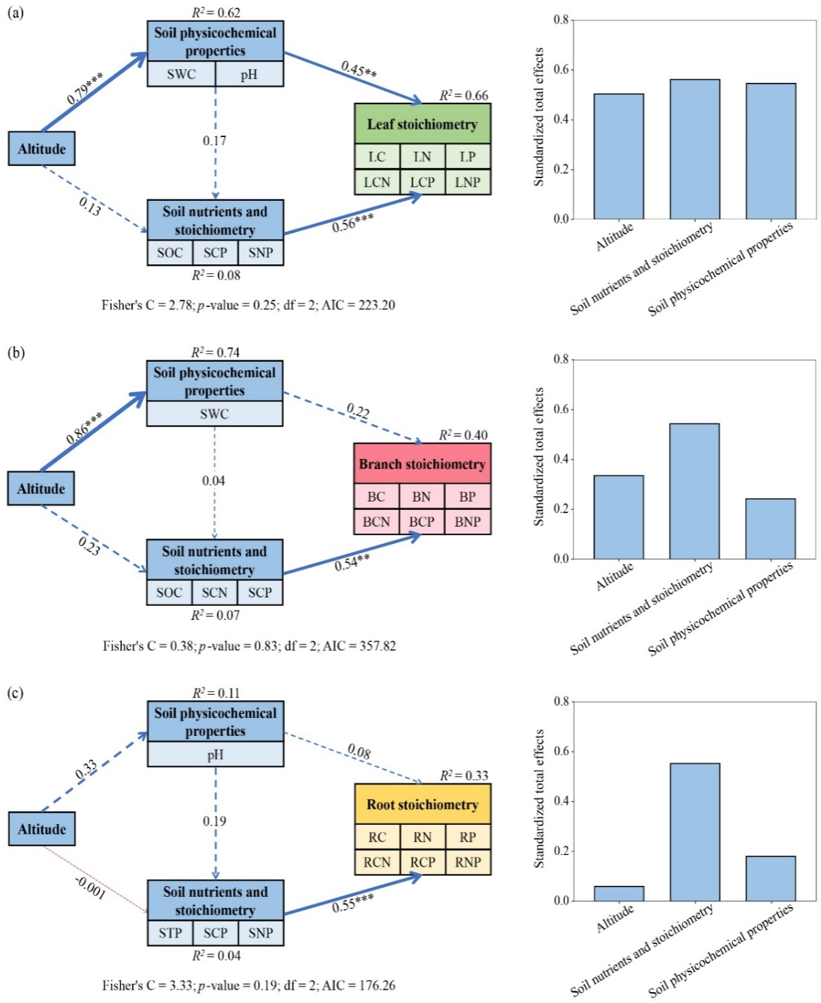 (叶片(a)、枝条(b)和根系(c)化学计量特征影响因素的结构方程模型分析)